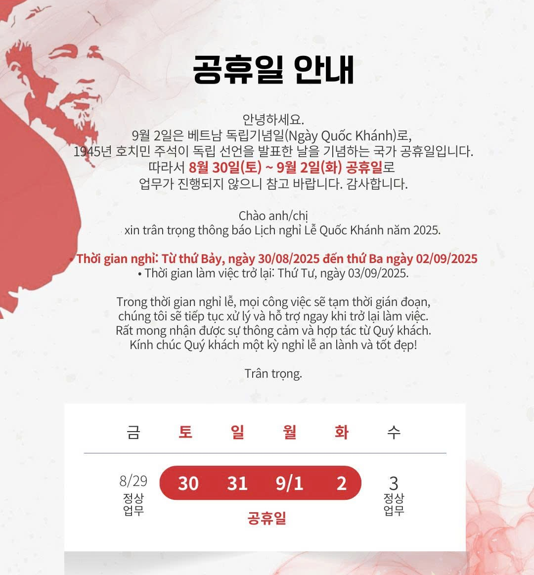 9월 1일부터 2일까지 양일간 베트남 공휴일로 인해 입고, 출고, 고객센터 모두 휴무입니다.